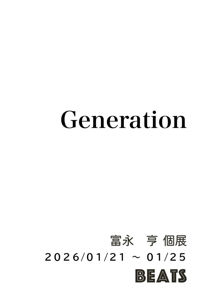 富永 亨「Generation」 2025.12.29 開催日: 2026年1月21日 - 2026年1月25日カテゴリー: _2026年, 1Fメインギャラリー, 2Fコビーツ, これからの展示 1F メインギャラリー・2Fコビーツ 富永 亨
