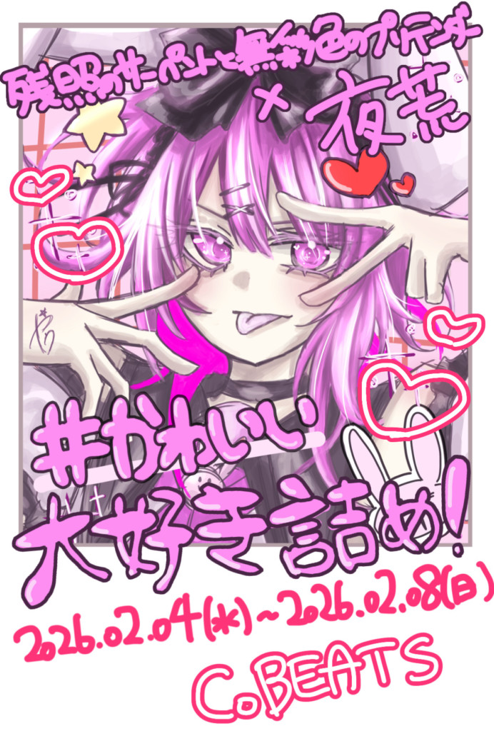 残照のサーペントと無彩色のプリテンダー × 夜荒「#かわいい 大好き詰め!」 2025.11.162026.01.16 開催日: 2026年2月4日 - 2026年2月8日カテゴリー: _2026年, 2Fコビーツ, これからの展示 2F コビーツ 残照のサーペントと無彩色のプリテンダー / 夜荒