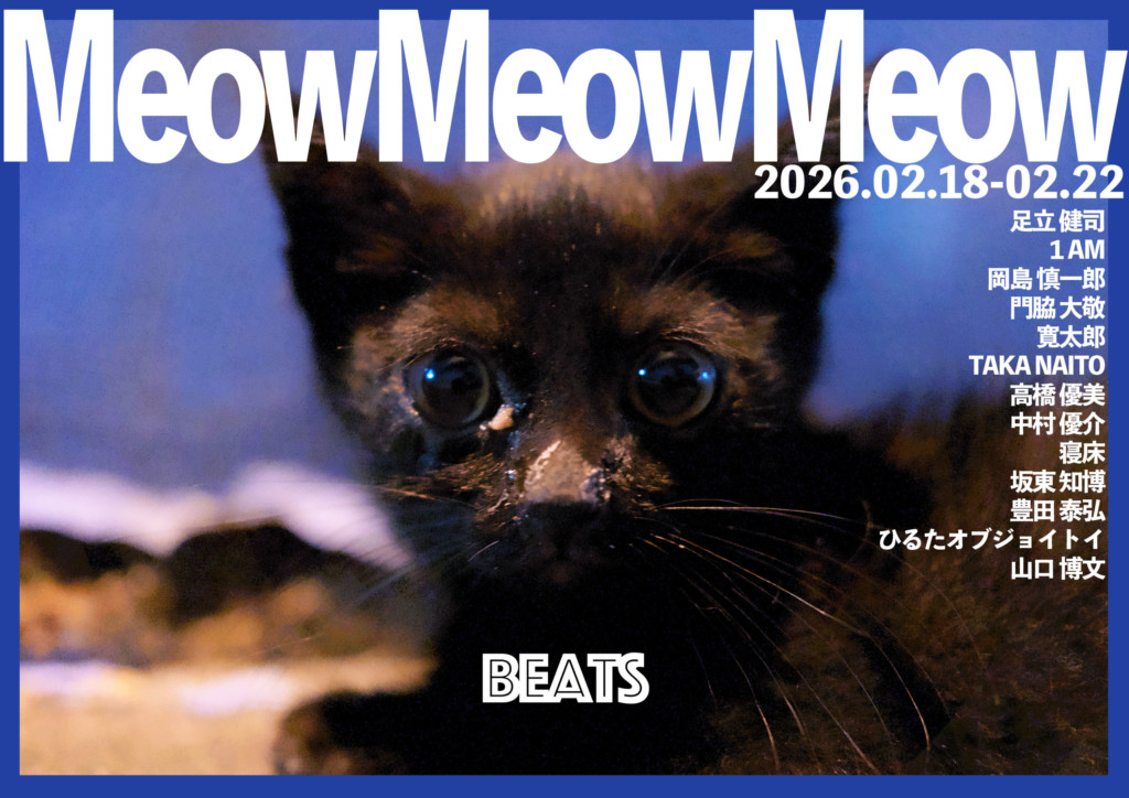 MeowMeowMeow 2026.02.20 開催日: 2026年2月18日 - 2026年2月22日カテゴリー: _2026年, 1Fメインギャラリー, 2Fコビーツ, 今週の展示 1F メインギャラリー・2F コビーツ 足立 健司 / 1AM / 岡島 慎一郎 / 門脇 大敬 / 寛太郎 / 紫艶 / TAKA NAITO / 高橋 優美 / 中村 優介 / 寝床 / 坂東 知博 / 豊田 泰弘 / 山口 博文