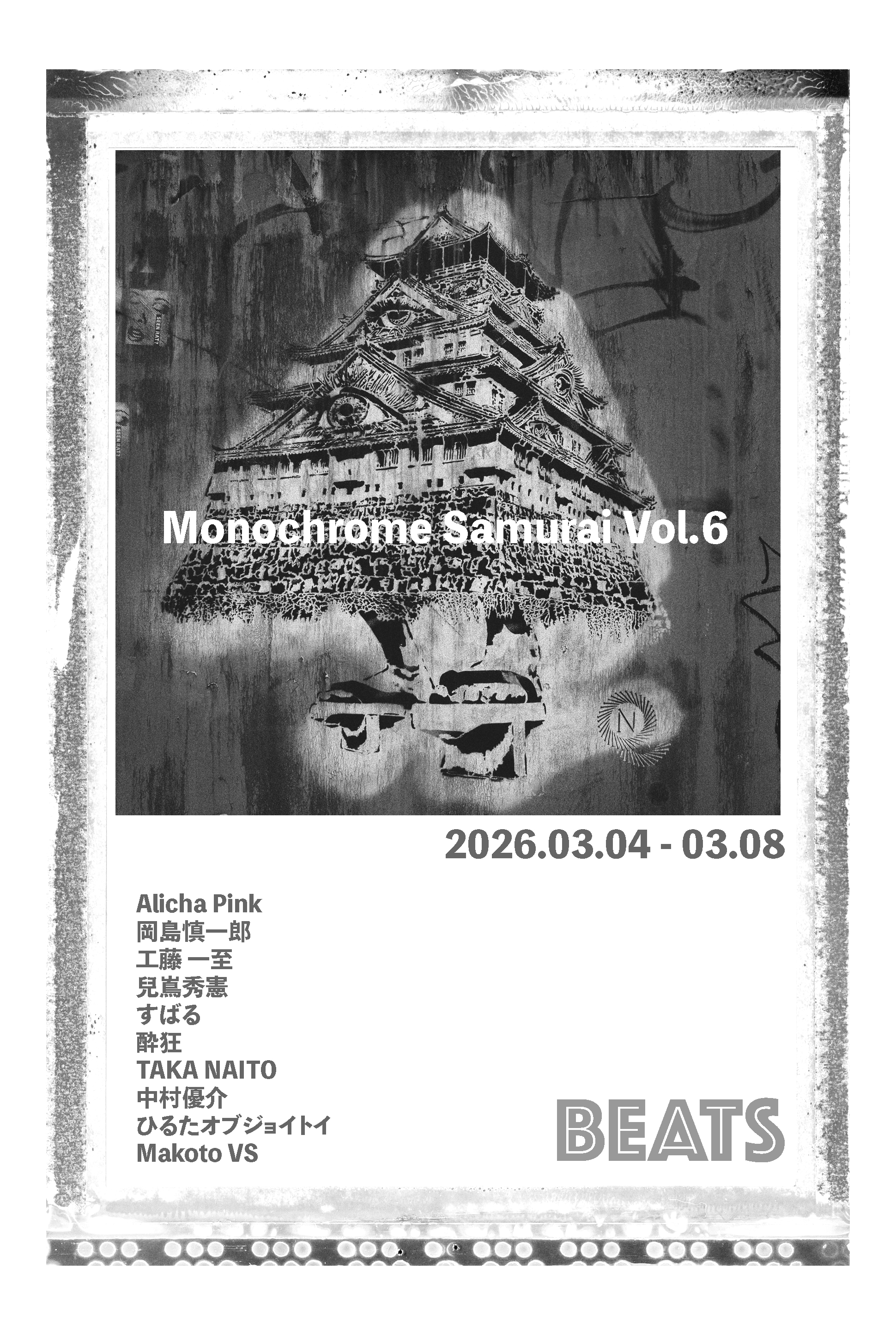 Monochrome Samurai Vol.6 2026.01.192026.02.11 開催日: 2026年3月4日 - 2026年3月8日カテゴリー: _2026年, 1Fメインギャラリー, 2Fコビーツ, これからの展示 1F メインギャラリー・2F コビーツ Alicha Pink / 岡島慎一郎 / 工藤 一至 / 兒嶌秀憲 / すばる / 酔狂 / TAKA NAITO / 中村優介 / ひるたオブジョイトイ / Makoto VS