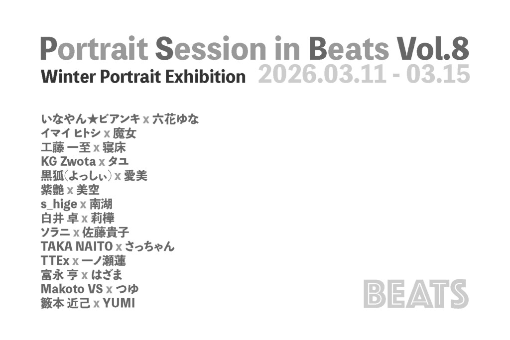 Portrait Session in Beats Vol.8 2026.01.10 開催日: 2026年3月11日 - 2026年3月15日カテゴリー: _2026年, 1Fメインギャラリー, これからの展示, 募集中の展示 1F メインギャラリー 【出展者募集中】「Portrait Session in Beats Vol.8」8回目の今回は冬のポートレート展、被写体被り無しでヌード&下着はNGになります。「大人の美姫展」40歳以上の被写体さん限定でビーツ4階での展示になります。ご興味あれば、DM宜しくお願い致しますー pic.twitter.com/moliwaFldB— BEATS (@beats_gallery) January 10, 2026 ご出展の申し込み 全ての項目をご記入ください お名前(出展者名) メールアドレス ご連絡内容 このサイトはreCAPTCHAによって保護されており、Googleのプライバシーポリシーと利用規約が適用されます。 Δ